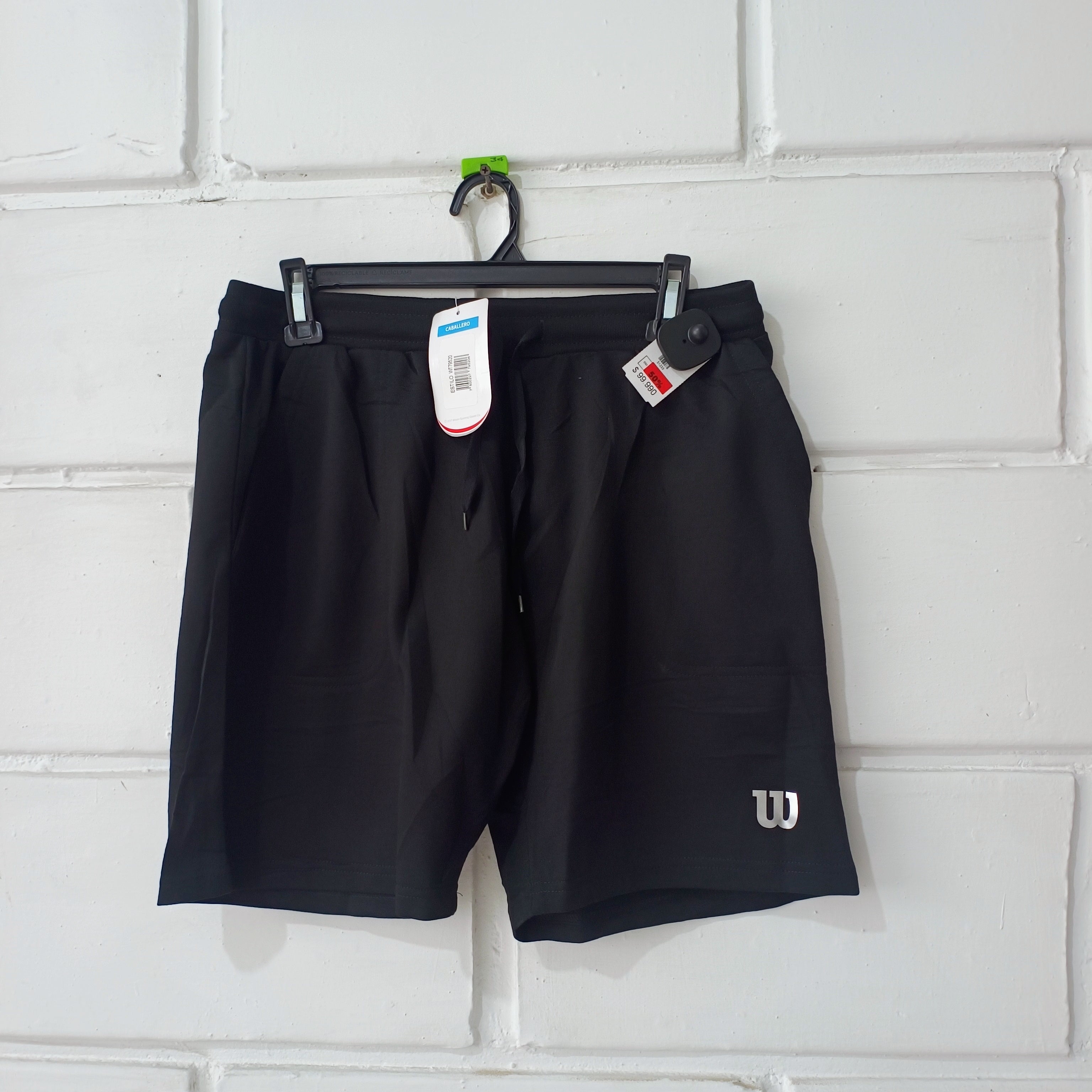 Pantaloneta Wilson para hombre color negro oscuro, elaborada en tela ligera y resistente. Cintura ajustable y bolsillos laterales. Ideal para deporte o descanso. Talla M. Marca Wilson.